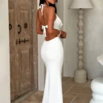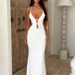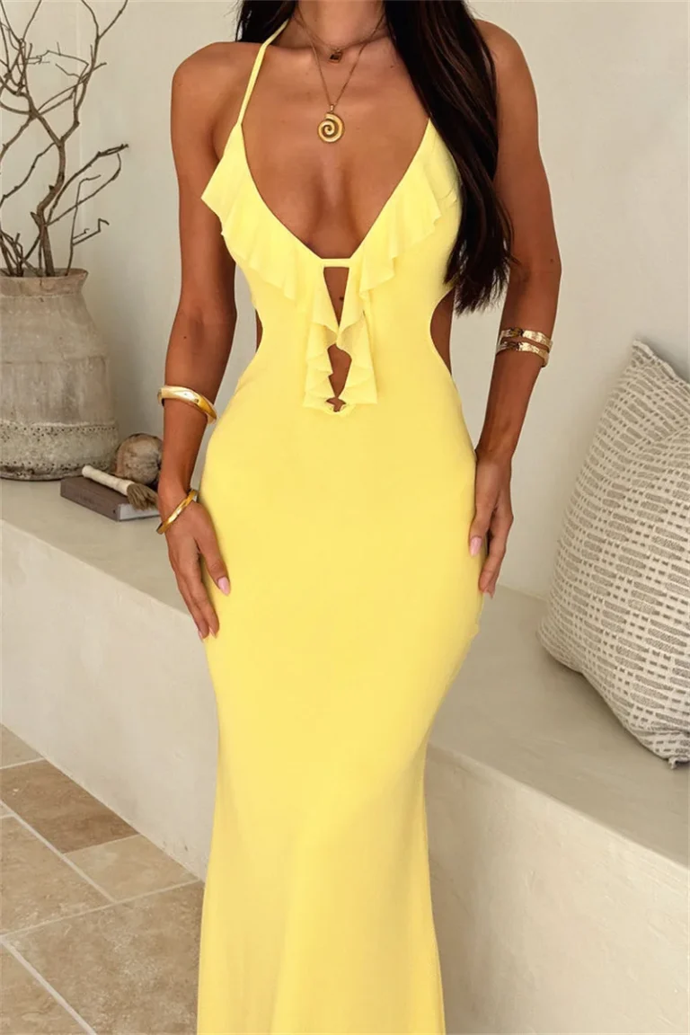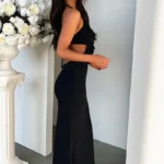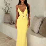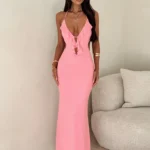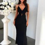 Vestido longo de gala, com uma silhueta em Linha A e perfil tipo A, esta peça é a definição de elegância audaciosa, combinando um decote em V profundo com um design sem costas impactante! O vestido é confeccionado em fibra sintética de alta qualidade com leve elasticidade, o vestido oferece o caimento perfeito para eventos especiais, garantindo conforto e uma presença inesquecível em qualquer estação.