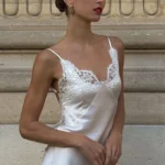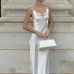 Vestido sensual e sofisticado, com modelagem justa que realça a silhueta de forma elegante. O acabamento em cetim com brilho suave e os detalhes delicados criam um visual marcante, ideal para ocasiões noturnas.
