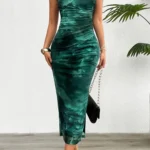 Vestido com silhueta em linha A e estampa em tintura desenvolvido para lazer. A peça apresenta decote em arco, mangas estilo morcego com detalhes decorativos em apliques e possui alta elasticidade e ajuste regulado para maior liberdade de movimento.